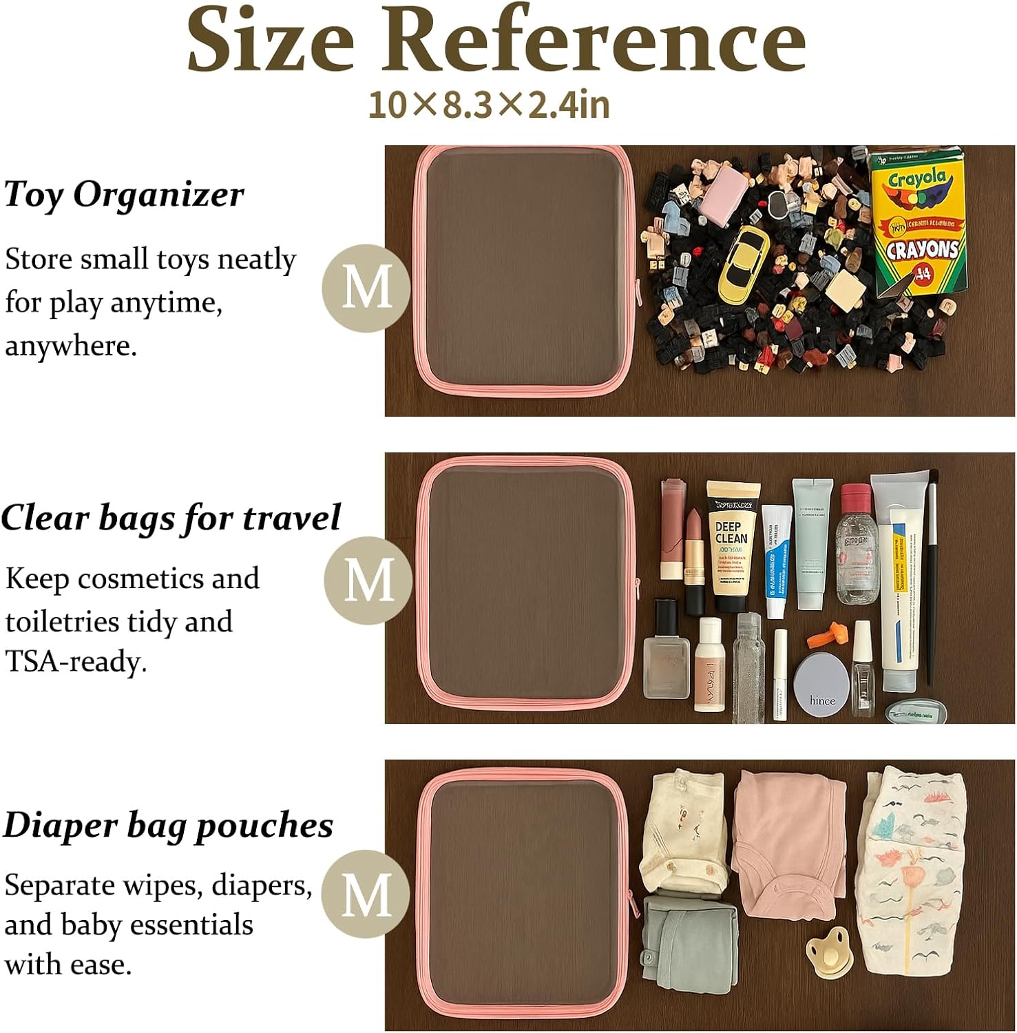 • Multi-Use Storage for Daily Essentials. Perfect as a bag organizer for makeup, toiletries, charging cables, pens, or travel-size items. Whether at home or packing a diaper bag, these clear zipper pouches help sort small items with ease.