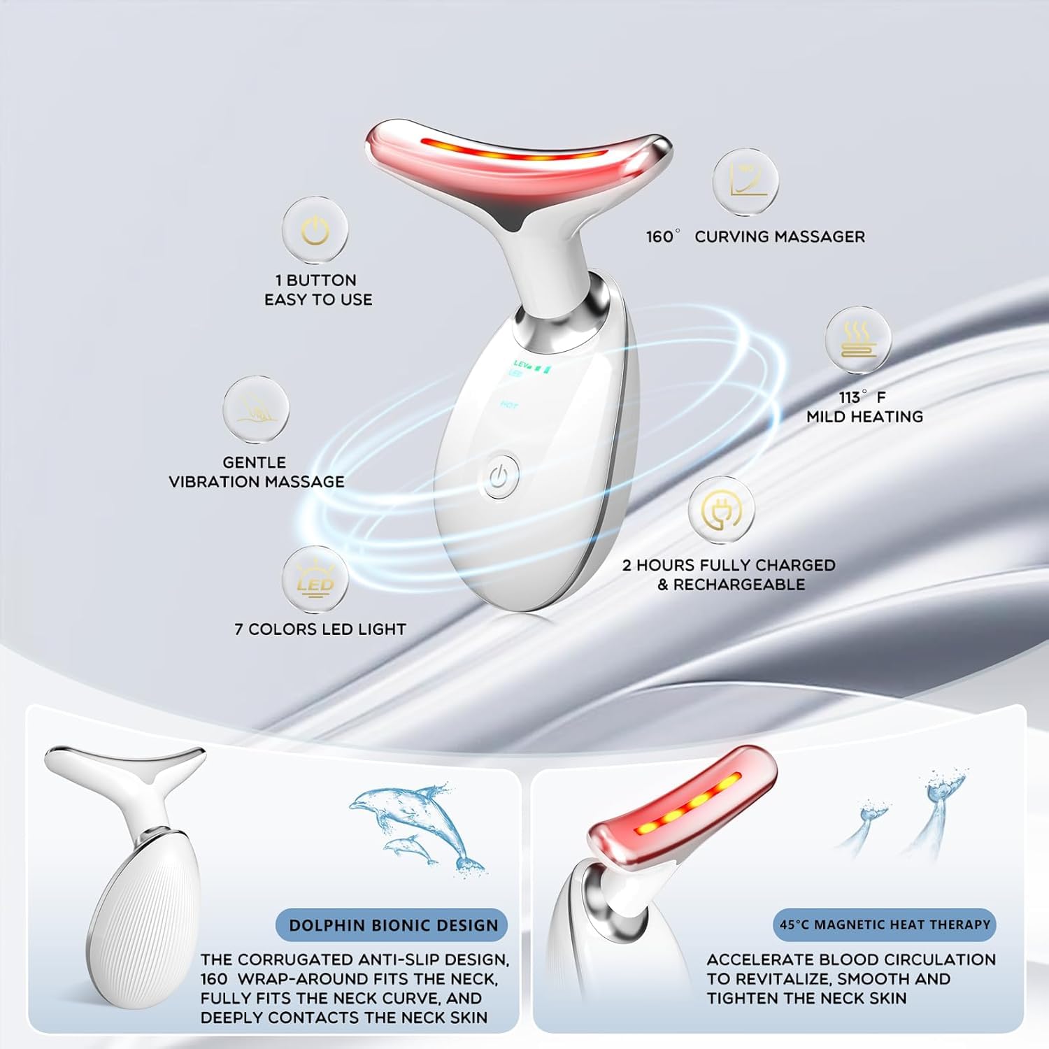 - 【EXQUISITE ERGONOMIC DESIGN】This facial skin care tool adopts a cute dolphin shape, which is compact and stylish, making it perfect for on-the-go use. The unique 160 degree curvature design can slide across your face easily and smoothly, and fit your face and neck perfectly