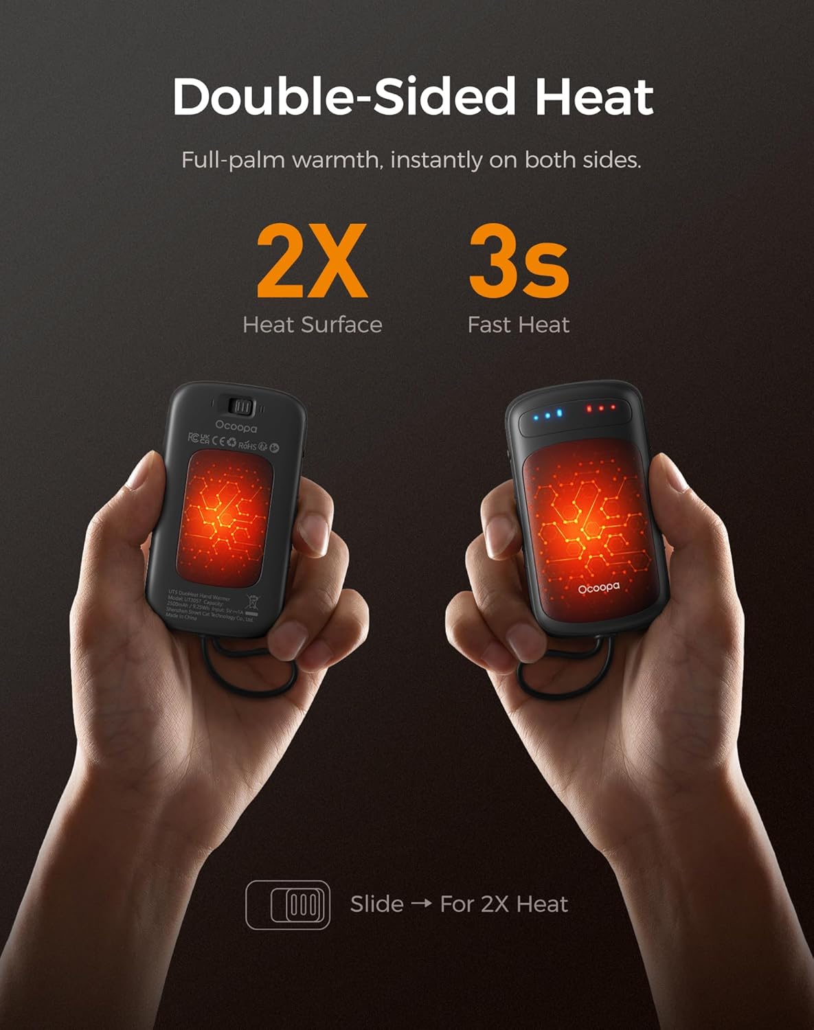- Instant Full-Palm Warmth – Double heat area with the dual-sided electric hand warmers, heats up in just 3 seconds, full-palm warmth from palm to fingers, perfect for camping, hunting, fishing, hiking, or the daily winter outdoors.
