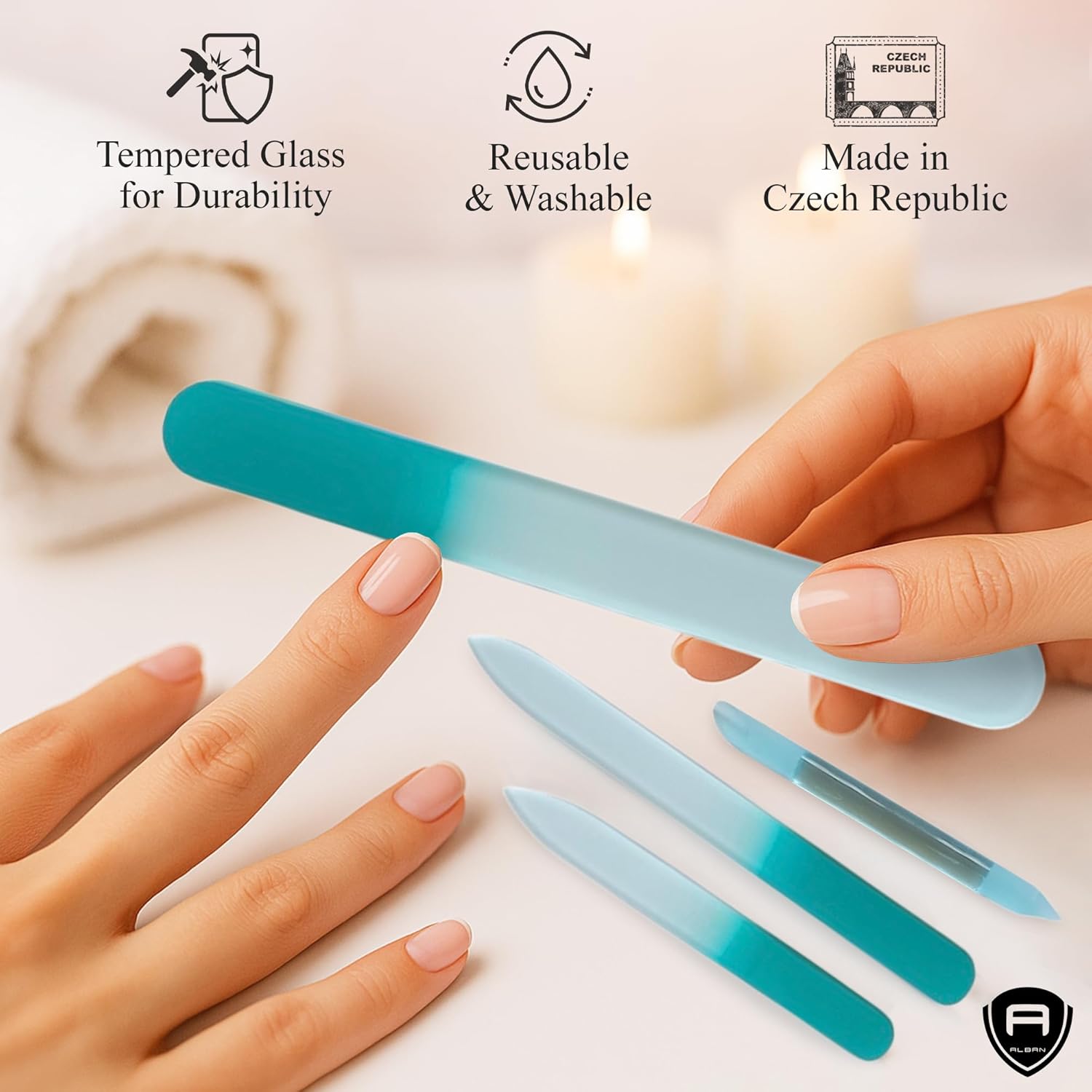 - Premium Czech Glass Craftsmanship: Each nail file is made from genuine Czech tempered glass, renowned worldwide for its strength, precision finish, and long-lasting performance. Designed to gently shape, smooth, and seal the nail edge without splitting or tearing.
