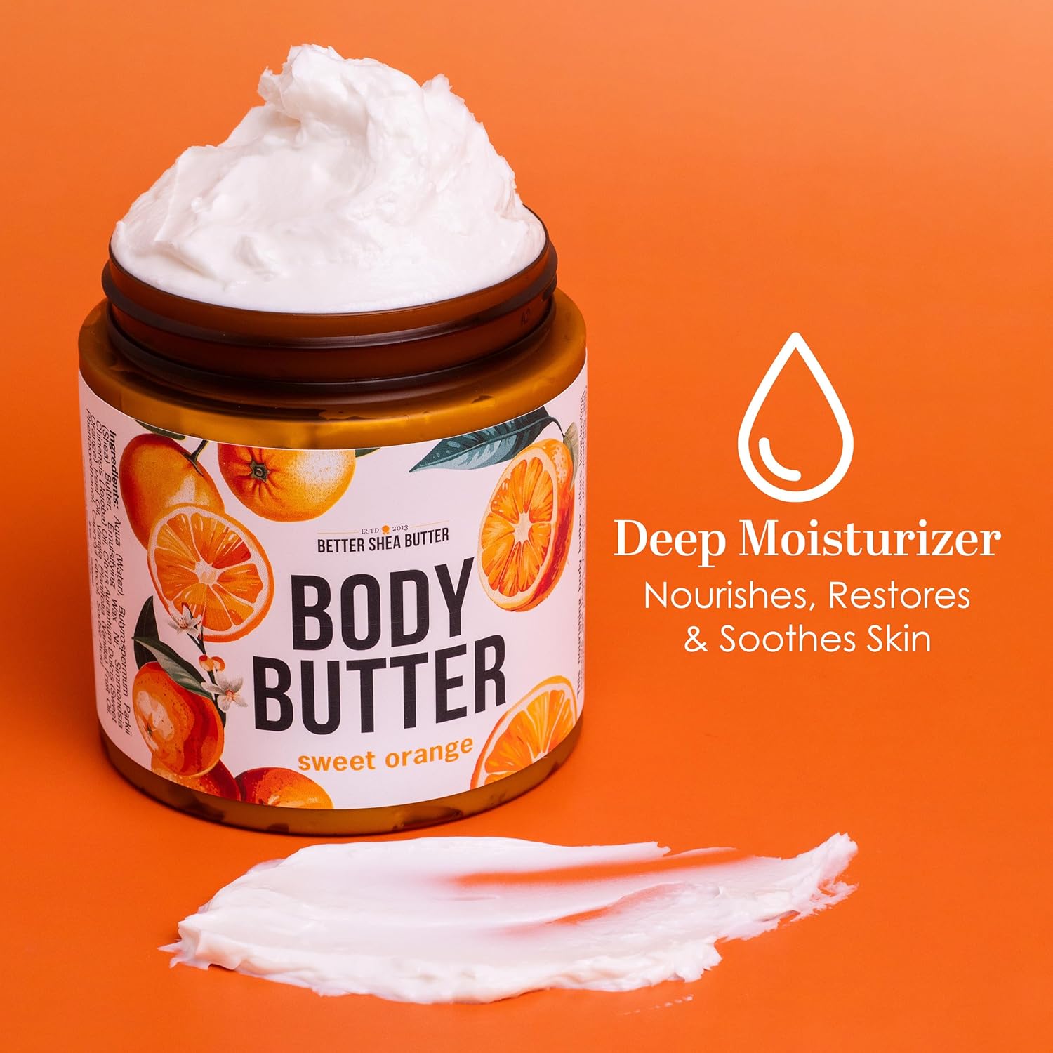 Sweet Orange Body Butter - Raw Shea Butter with Jojoba Oil, Orange Vanilla Body Lotion Scented with Essential Oils, No Synthetic Fragrances, Full Body Moisturizer for Dry Skin